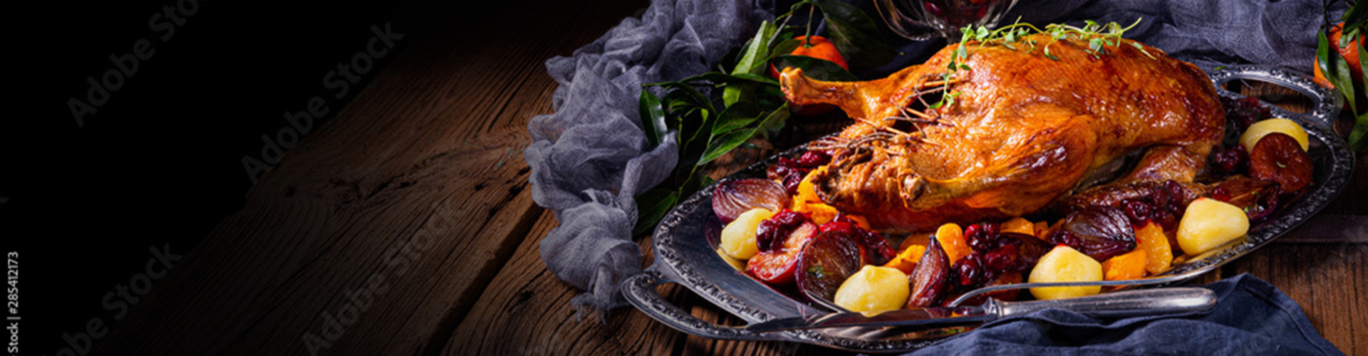 - Die Ente auf ein Backofenrost legen und eine Fettpfanne (Backblech) mit Wasser darunterschieben und ca. 2 Std braten.